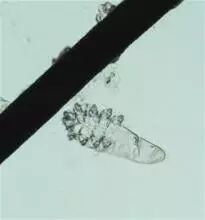 李军花和林晓蕾医生检查后,发现程女士的睫毛上沾了很多蜡样的分泌物,像袖套一样包裹着睫毛根部,这不是普通结膜炎会有的症状。李医生拔了程女士的几根睫毛到显微镜下检查,终于找到了病因:七八条蠕形螨正沿着程女士的睫毛在缓慢爬动。