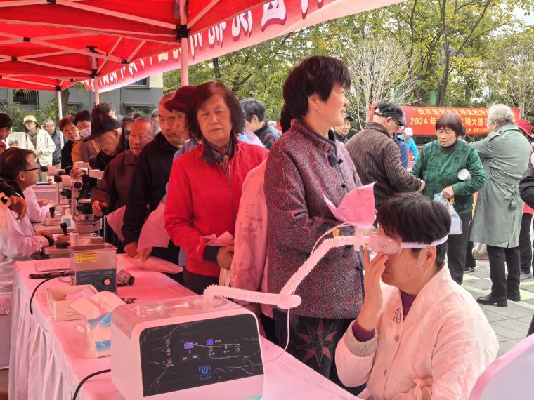 天气虽然渐凉,但仍阻挡不了大伯大妈的热情,九点不到的时间,义诊长桌前就排起了长队,前来检查的居民们在志愿者的引导下有序进行登记问诊,一对一咨询。现场设有眼病筛查、干眼熏蒸、眼镜清洗维护、量血压等服务,专业贴心,尤其干眼熏蒸理疗体验项目很受大伯大妈们的欢迎。